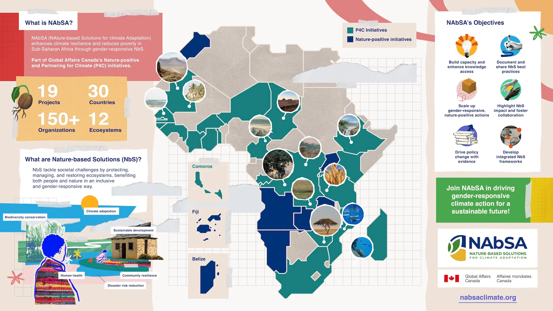 NAbSA, una iniciativa de Asuntos Globales de Canadá, apoya 19 proyectos en 30 países (27 de los cuales están en África subsahariana) para desarrollar un marco con perspectiva de género para soluciones basadas en la naturaleza con beneficios para la biodiversidad.